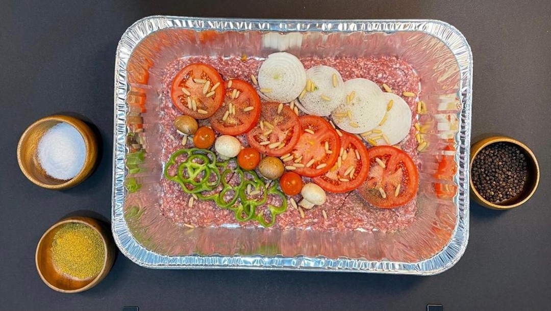 chilled lamb and veal mixture topped with sliced tomatoes and fresh onions, ready to be cooked in the oven for 45 minutes
